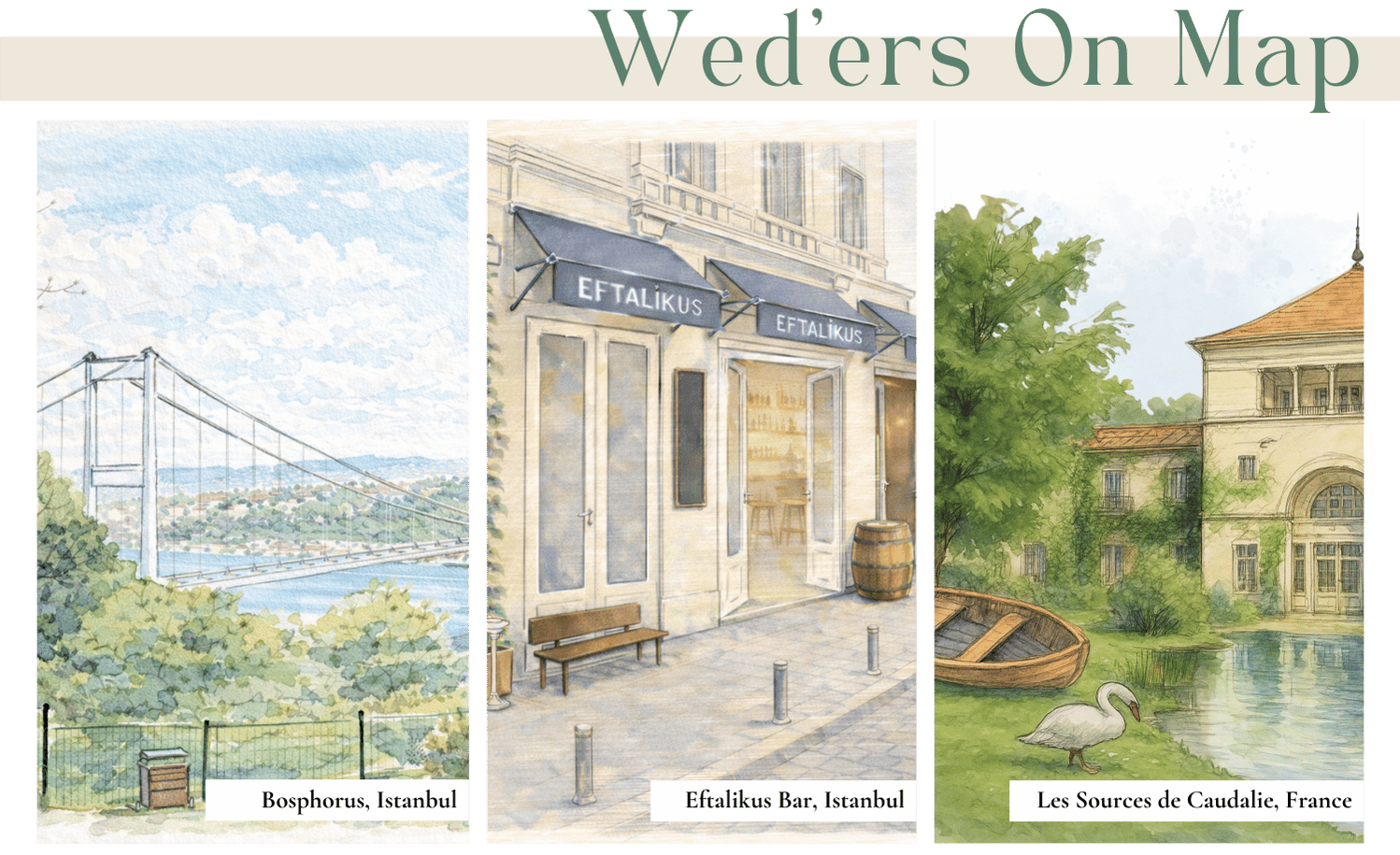 Her çiftin bir hikayesi, her hikayenin de bir mekanı var. Bu yerleri resmediyor, onları özel tasarım bardak altlıklarına dönüştürüyoruz. Bir hediyenin ötesinde, çiftlerin anılarını misafirlerin evlerine taşıyoruz.